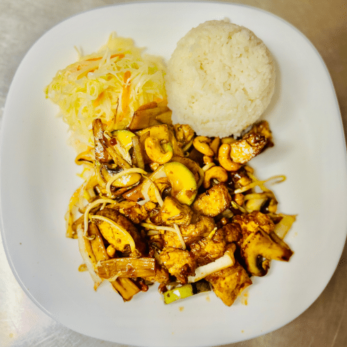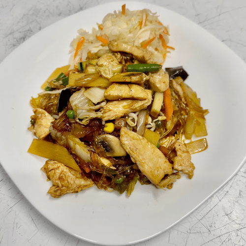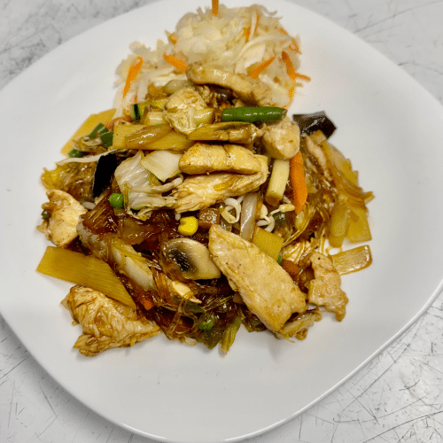 z makaronem ryżowym, kurczakiem, tofu i bambusem